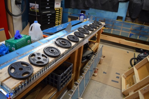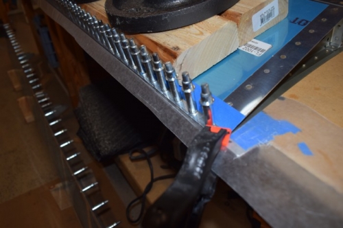 I should have read ahead or at least better read the instructions that don’t mention anything about installing the blind rivets for the bottom skin to the ribs. This would allow it to more easily install the trailing edge with pro-seal smeared all over it. Instead, I had to slide the pro-seal soaked trail edge between the skins and clean everything up before clamping it down. During the week I added an aluminum angle to the other workbench so I can clamp everything down. This was needed since my workbench isn’t as long as the flap. The first one I did with steel, but that took forever to drill so I did this one with aluminum and drilled the holes so it would be a continuation of the other work bench hole pattern. Next for the day of pro-seal, I first cleaned the interior trail edge with scotchbrite pads and acetone, until it was cleaned. Then, my wife helped spread the skins with popsicle sticks while I coated the interior with pro-seal. I then smeared a thin layer on the trail edge and slid it between the top and bottom skins. It made a big mess, but I managed to get it cleaned up and clamped down. I put down wax paper to make sure it doesn’t stick to the bench. The garage is a little cold so I’ll run the heater until it sets up.