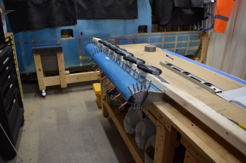 With the flaps mostly finished and out of the way, I was able to get back on the ailerons. I primed the remaining skins, ribs and stiffeners. Once that was complete, I riveted the doublers to the main ribs. I tried back riveting this time, which was much faster, but still deforms the rib a little. I back riveted all the stiffeners and main ribs to the skin. Per the instructions, I put it all together in prep to drill the trail edge, but I’m not to keen on putting a bunch of holes in my table, so I may pick up some flat boards to put under the aileron.