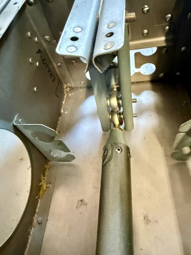 Connected the CS-00002 Elevator Push-Pull Tube to the CS-00012 Idler Arms. Connecting Push-Pull Tubes is often a frustrating process. The bolt has to pass through one of the Idler Arms, through washers inserted on both tight sides of theTube's rod bearing end, through the other Idler Arm, then through two more washers and the metal stop nut. At least three hands are needed to juggle the multiple parts, in a confined space, with gravity often working against you. After numerous attempts, success is so sweet. The next task is the attachment of the CS-00001 PUSH-Pull Tube to the CS-00006 Control Column forward of the Spar and within the Cover Ribs.