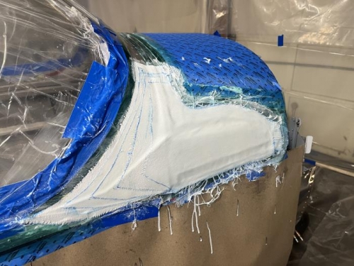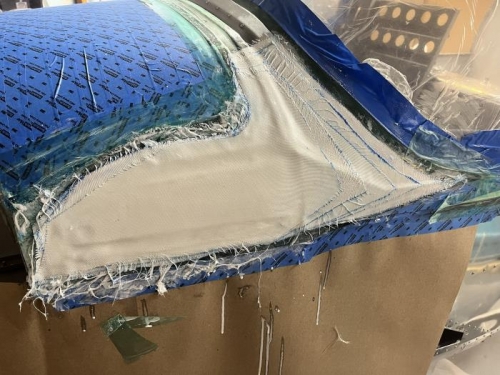 The cutouts from Step 6, I did immediately after glueing the foam blocks to the canopy frame. Now it was only filling them with epoxy-flox mixture. After that I place cling wrap on my work bench and placed the first ply onto it. Filling it with resin and using a squeegee to not overwetten it worked reasonably well. But placing the form over the canopy arms did absolutely not. At first, I sought the guild at the light weight cling wrap and switched to another firmer wrap. This time I needed to go to the other side, because the form flipped side from tranferring it to the other wrap. However, I turned out not to work any better. So I quickly cleaned both sides from my mess and went inside to recut a new ply #1. I already wanted to call it a day and suspected the type of cloth to be the culprit until my technical advisor called and clarified that that wasn't the case. Next, I manually pressed the ply #1 into its position over the canopy arms, and use the brush with the shortened hair to spread the resin and push ever so little in each direction until I reached a satisfactorily result. For layers 2-5 I did the same. Considering how much trouble I had, I am quiet satisified with the result. Maybe the recesses, thos areas where there is nothing below, are a little bit deeper than they might have been with the cling wrap. But who knows, it might also be that this just shows prominently because I used white dye for my epoxy, since I want to paint the skirt white. On the tube of the dye West systems advertises it, that this color shows even the tiniest inconsistensies. After about an hour, using the slow resin/hardener (206) mix, at abround 65 F, I had to remove one bubble on top layer on the right side. BTW: I decided not to fight those fibers at the aft and lower border because, to my understanding, these areas will be cutoff after curing anyhow.