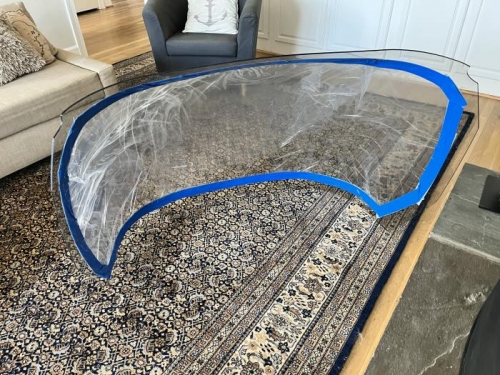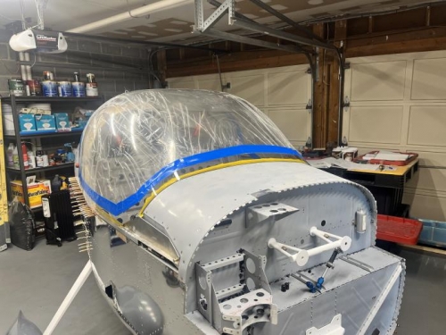 Covered the Canopy Latch opening, the side rails and the front bow with yellow painters tape, as per KAI. Removed the protective film around the outer most 2.5-3 inch of the canopy bubble and fixated the rest with blue painters tape. Lifted the Canopy Bubble together with my son in place. There it will stay at least for the week, as the weekend is over and it is too cold to heat up the garage just to do canopy work for an hour in the evening.