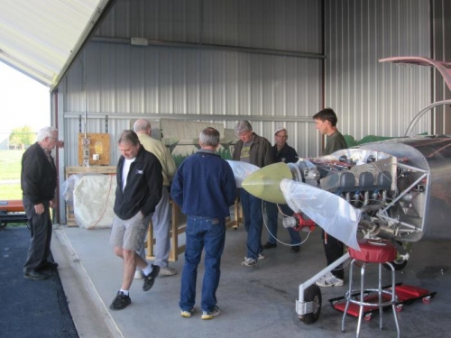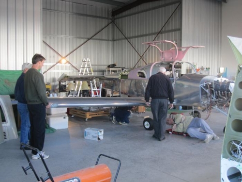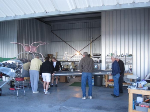 With the assistance of Janice, Tom Webster, Brent Owens, Jim Baldwin, Dan Hempy, Joe Strausbaugh, Dana Saucier, George Mellon, and Jeff ? we removed both wings. They are just about ready to ship off to paint.