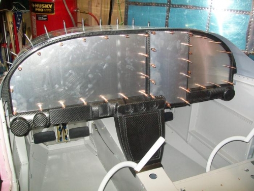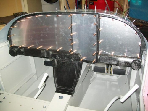Renee assisted me this afternoon with drilling the mounting holes for the instrument panel inserts. I drilled a #27 hole through the carbon fiber instrument panel and the aluminum support panel.