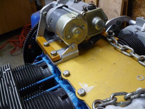 Also fabed up a bracket for the Starter. Again thanks and Kudos to Ron Milan for the ideas here. Flipped the gold piece over and use a piece of 2" x 1/4" 6061-T6. 3/8" thick would have worked better but I can weld that area thicker. Still have a little more work to do there but It's close.