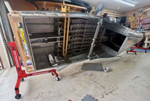 Mounted the Tail on the Aft Rotisserie Mount after attaching another board to the one already mounted the the tqail bulkhead. This was added so that I could lower the attachment hardware to the center of rotation, matching the level of the front mount. With the mount positions, the aircraft rotated easily and doesn't hit the floor.
