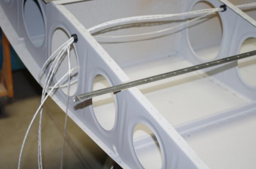 Began wire runs in wings. Installed grommets through ribs