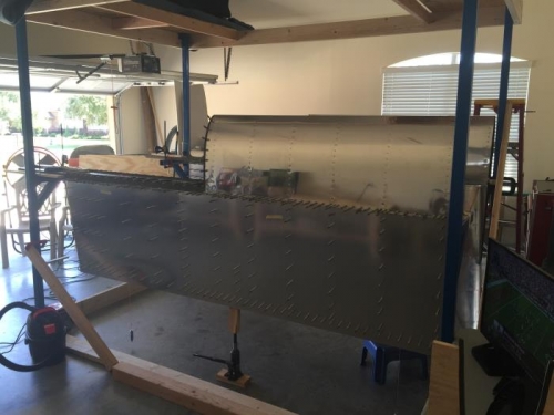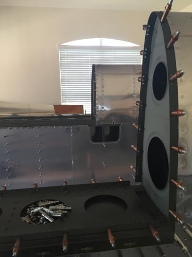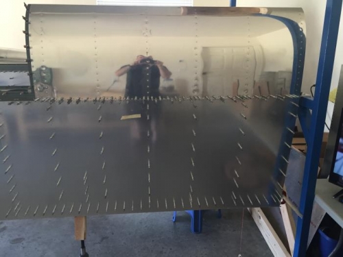 Mounted the newly riveted right wing leading edge on for I believe the final time. The internal leading edge and main ribs are both clecoed together and to the main spar. The nut plates for the fuel tank are all in place. The leading edge is attached and the countersinks in the spar and the skin fit nice.