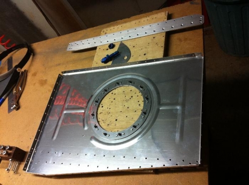Fit doubler ring to front wall of fuel tank. Dimple and countersink as required and rivet ring into place. Cleco front mount plate to tank and drill of bracket support clips. Countersink front mount bracket lower row of rivet holes. Mark out fuel guage mount plate (and tank internal access cover) for extra fuel fittings for auxillary tank plumbing. Also mark out return pipe fitting anti rotation bracket.