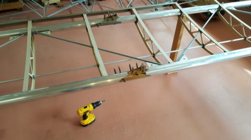 Lift strut brackets. Drilling holes in spars for lift strut brackets installation. Deburring. Working on wing root doublers.