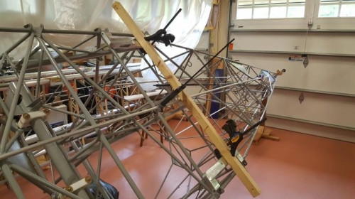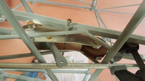 Working on fuselage bottom stringer. Because of the Grove landing gear there is interfering with flap handle.