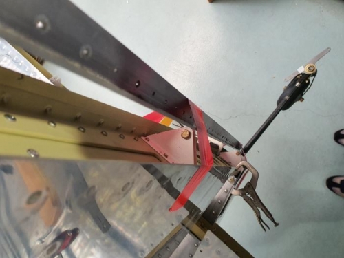 When the vertical stabilizer is properly aligned, drill the front spar to the F-781, using the pre-punched holes as guides.