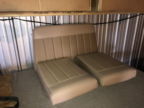 Jeanne stripped the old upolstery from the seat back frame, and she and Sam did a preliminary fitting of the new material. Seat cushion came pre-assembled.
