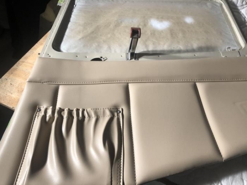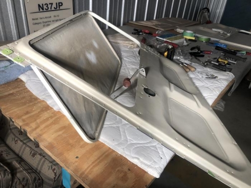 Right door: Installed window by riveting hinges. Lined up latch to match new location in left door and existing threaded holes in window frame. The interior panel has not been cut for the bracket, will have to do that ourselves. Riveted latch to door, two pop, two squeezed.