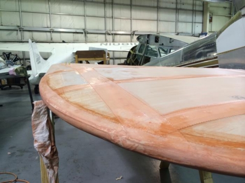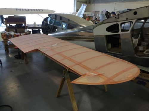 Summary entry for 4/21 - 4/24. Completed taping of top right wing. Pretty much entire wing ready for spray coats now, except for a couple of spots that need cosmetic repir.