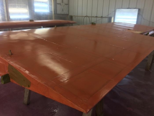 Sprayed extra (3rd) coat of Poly-Brush on bottoms both wings. Looks like we got a good job and the wings are REALLY pink now!