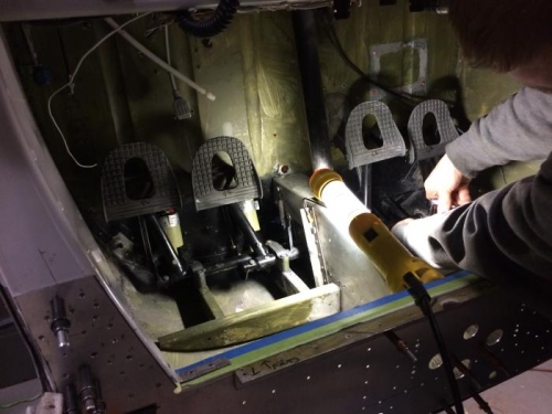 Sam and I removed the clamps that hold the pedals in place so we can get at rivets to buck them. One bolt stripped, had to cut off nut.