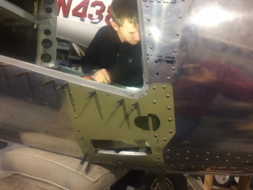 Bill and I finished riveting nearly all of the lower right side doorpost repairs. All AD5 rivets, Bill bucked from inside. Tough job.