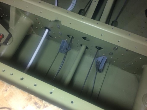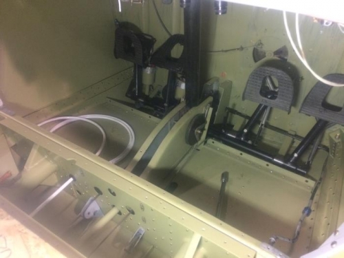 Sam was able to install right rudder cable pulley (on left sideof airpane) under the baggage floor, and also inspect and lube the other 5 pulleys under there. Installed control column at pivot point and connected elevator push rod. Began ereinstalling the aileron chain and linkages, found they need some restoration, pulled out and set aside. Noted bad condition of rubber boots on yoke universal joint. Ran aileron and rudder cables through gear box. Began installation of rudder pedals.