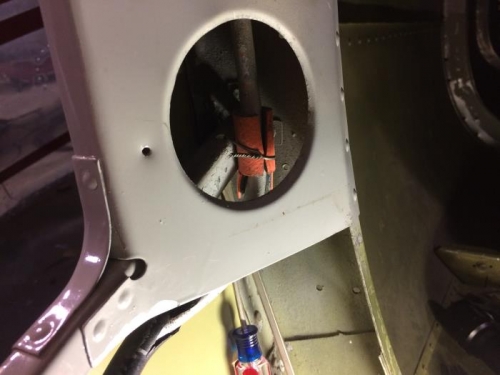 Removed gas line behind right door frame to gain access. Pulled bucktails, drilled oversize holes, and installed repair rivets in two location just aft of right hand door. Jeanne and I must have missed these during dissassembly way back when.