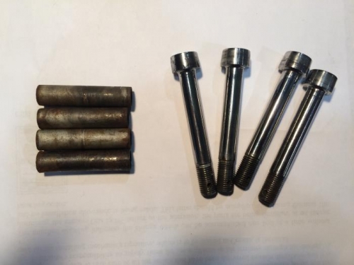 Jeanne brought in the bolts Ken had finally found (and polished up) and we test fit them,and they are correct! I removed the rubber mounts and sleeves. The sleeves are pretty rusty and one is cracked. WIth Kurt's help Jeanne ordered tubing to make new ones.