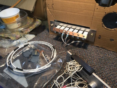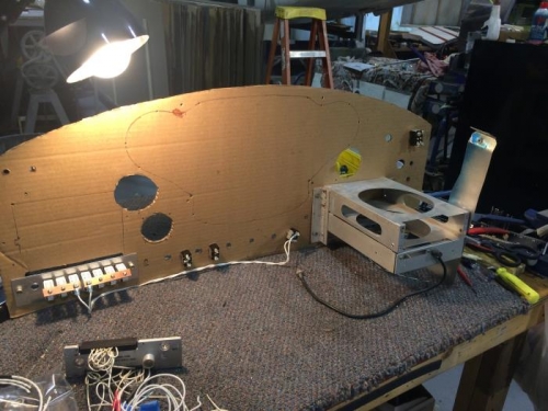 Moved all parts and pieces back to airport. Set up cardboard mockup and added breakers and switches. Fabricated bus bars and installed on breakers. Wired the avionics master. Started looking at the avionics trays and identified work to be done. Looked again at possibility of relocating co-pilot jacks to lower right panel.