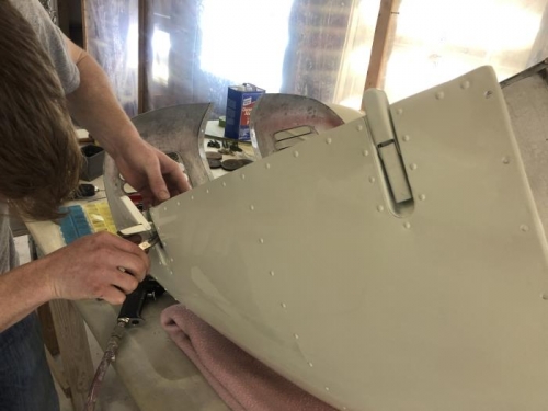 Took left over paint to my T hangar and put in freezer. Looked over old skins to verify my understanding of attachment points and .020 rub strips. Sandblasted aileron pulley brackets. Got new bolts for pulleys.Sam found engine mount bolts and rubber inserts. Also the bracket filter for the air intake. Sam built wooden frame to set the engine in for transport and he and Tom loaded it into my car. I caled Kurt Kabelle and borrowed engine lift. Sam and I drove out to Milton's and Cliff Frasier helped us unload the lift and the engine and move them next to the fuselage. Sam and I mounted the engine to the airframe. We pulled off the masking from the firewall area and the doors. I got the paint information for the log entries. (Poly-Fiber Aero-thane. Base coat is 105 Insignia White, trim is 176 Insignia Blue.) Sam assembled and riveted the cowl latches.