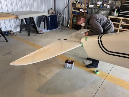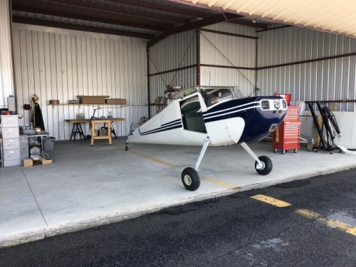 I cleaned and reorganized the T hangar while Sam flew the RV up to Piseco and swapped for Jane's plane, coming back here for annual.Sam and Tom pushed the 120 down tothe T and we set up a work area wth tables, tools, and benches. We revievew lists and began installing HS with trim rigging.