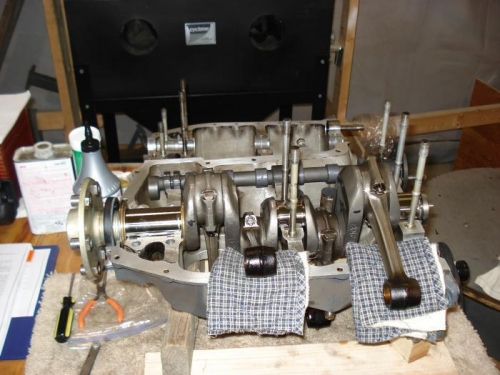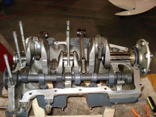 Installed cover pads for fuel pump and oil cooler and torqued down. Installed valve lifter bodies. Installed prop seal on shaft. Installed cam & lubed lobes & lifter surfaces. Installed cam. Installed crank assembly and thrust washers. Checked dimensions.
