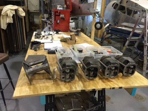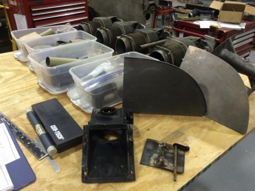 Got out all cylinders and double checked previously taken measurments. Confirmed all rocker bosses out of spec. Located reamer (Bill's) for reaming boss holes, made test hole in thin aluminum, verified bushing are a good fit. Recieved new gear box side plates from Chris, turned over to Bill for further work. Checked carb heat box after disassembly by Chris.