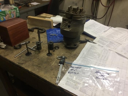 First day to do hobby work after a long summer/fall layoff. Moved the six cylinders that came from Ken Sherwood's 170 into Kurt's work area (warmer) and removed valvles using Ed D. compression tool. Checked dimensions all six cylinders.Some wear but not bad. I think we can find 4 good ones, possibly with some minor repirs.