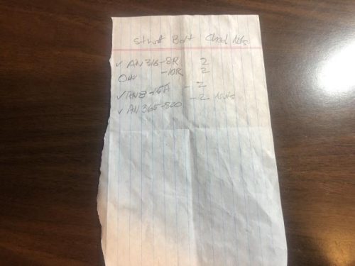 Received Spruce order, found only two wing mount bolts, but four of the thin nuts for the aft strut connection, we need only two.