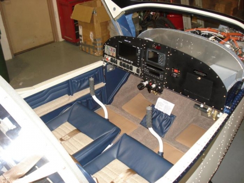 Finished installation of interior kit except for placement of headset straps. Reinstalled my earlier mod for a baggage tie down strap. Ordered a cover piece for the front of the tank. Made a couple of suggestions for changes to Abby.