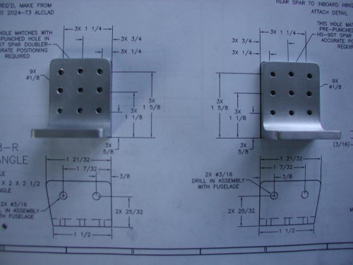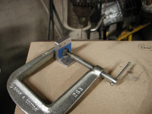Clamped the two brackets together to drill the top-center alignment hole so they will be in precisely the same position on each bracket. Drilled pilot holes and then drilled the holes to #30. Finished deburing and polishing the brackets. The two lower holes are "drilled in assembly" so have only marked their eventual location.