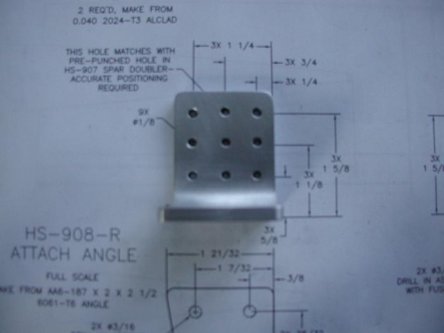So... after drilling the #30 holes in the brackets I was quite dissatisfied with the alignment of the holes. I drilled small pilot holes, but the drill still wandered around a bit. I did not hole punch the holes prior to drilling because Van's says not to. Well, after mulling this over for a while I sent an email to Van's along with a picture of the brackets. There response was that the brackets look fine and to "get on with building". They also said using a hole punch to mark holes is fine on angle and heavier gage aluminum sheet stock. Even though Van's was ok with the brackets I was not. I ordered a new piece of angle stock and will build a third set of HS Brackets and will use a hole punch so the holes will be nicely aligned. I'm not really a perfectionist... just sounds that way :-)