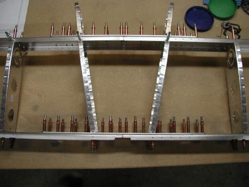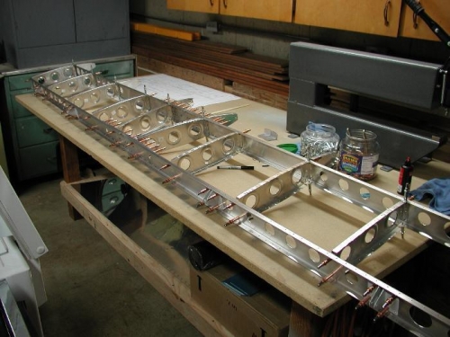 Finished match drilling the HS-904 main ribs and the HS-905 nose ribs to the spars. Numbered the ribs left and right for reassembly reference. The next step will be to dissasseble the parts, debur and scuff and then set up the HS jig cradle blocks and begin assembling the HS sub-assembly structure inside the HS-901 skins.