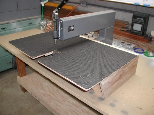 Constructed the platform for the DRDT-2 dimpler. It is three feet wide and two feet deep. I designed it so it can slide forward six inches to provide support in front of the dimpler mechanism when needed (see pictures). It functioned well when dimpling the HS skins.