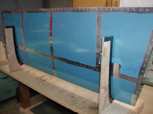 Finished the last HS right side inboard nose rib-to-spar-to-main rib rivet... hooray! I need to touch up the primer where it got rubbed off in a few places. Will do that the next time I mix up a batch of primer. Worked on riveting the right skin to the front spar and main ribs.