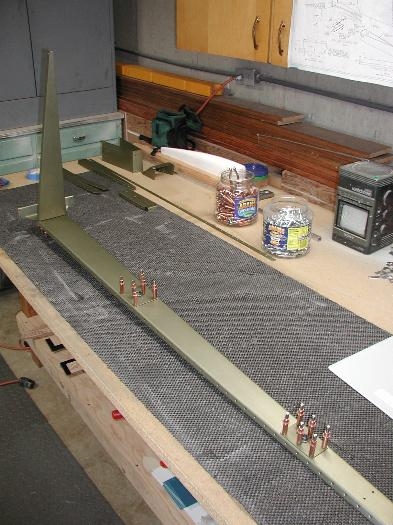 Prepped and primed all the Rudder skeleton parts. Went and worked in the yard for a while with Debbie while the P60G2 primer dried. Then I clecoed together the spar and associated parts and riveted them together.