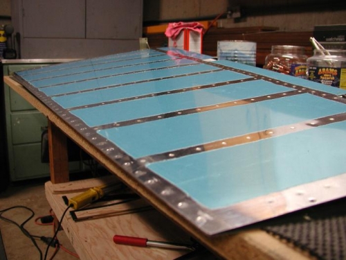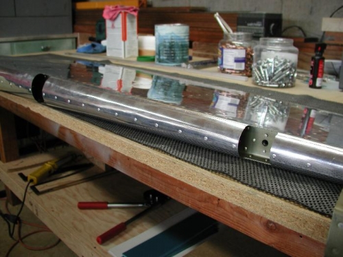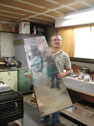 Its been 2 1/2 days since I glued the trailing edge and it seems to be well cured. I pulled all the clecoes, cleaned the sealant out of the dimples and wiped the edge with lacquer thinner so the rivet tape would hold properly. I decided to alternate the factory head position of every other rivet. Placed the first set of rivets and taped them in place. Turned the Rudder over and partially set the rivets with the back-rivet set. Turned the Rudder over again and used the mushroom set to finish setting the rivets... they all turned out pretty nice. I then went through the same procedure on the other side of the Rudder. I am quite pleased with the results... nice straight trailing edge and all the rivets set very nicely. My son, Kevin, helped me roll the leading edge, which was a bit of a task. I then drilled, deburred and set the blind rivets. Last item to complete was fitting the rod end bearings into the nut plates. Be sure to use the 3616 bearing in the lower location and the two 3614 bearings in the middle and top positions. My third part is completed... now onto the Elevators :-)