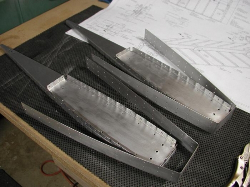 Finished deburring the holes in the right counter balance arm assembly. Also deburred the edges and scuffed the parts. Started and completed the whole process again on the left counter balance assembly. Beveled the aft and inboard edges of the counter balance skin as called out in the plans. I used my micrometer to measure the beveled edges... this worked very well. I left the beveled edges about .017. Still need to dimple both counter balance assemblies. Deburred the edges of both Elevator spars, end ribs and the E-910 reinforcement plates. Clecoed the E-910 plates to the spars and they are now ready to be match-drilled to #30.