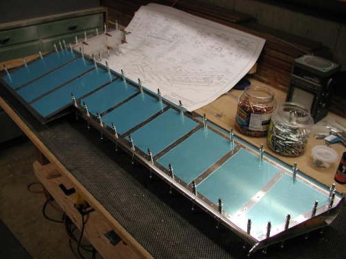 Dimpled the right spar and inboard rib. Made the E-921 gusset that attaches to the trim spar and the inboard rib. Clecoed the spar, inboard rib, trim rib and counter balance assembly into the left skin.