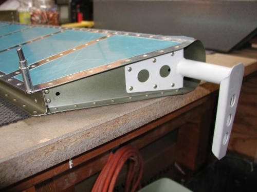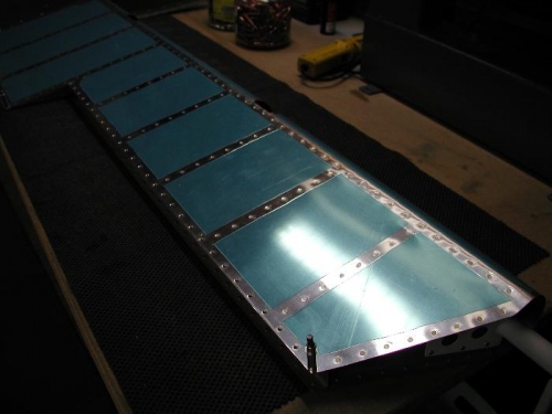 Back-riveted the skin stiffeners to the bottom skin. Riveted the counter balance assembly to the spar. Had to drill out one of the rivets about six times before I got it installed to my satisfaction. The hole was a little loose so I pre-squeesed the rivet a little so it would fit snug into the hole, which helped keep it from bending over crooked. Riveted the bottom skin to the spar with the blind CS4-4 pop rivets. Riveted the E-921 gusset to the inboard rib and the trim spar. Finisned riveting both end ribs and riveted the bottom skin to the trim spar. The left Elevator is now ready to have the trailing edge completed.