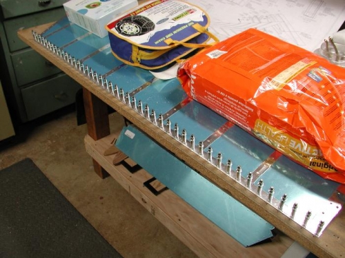 Marked the AEX wedge and clamped in place to match-drill the #40 holes. Drilled the holes into the table top and inserted clecoes to hold the parts in place as I drilled each hole. I started by drilling about every 10th hole and then moved to the hole centered between them and so on until all the holes had been drilled. Deburred the holes in the top and bottom skins.