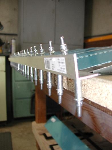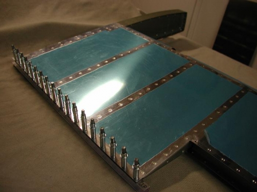 I used a piece of aluminum angle that was used to glue the trailing edge of the Rudder as support for the left Elevator. However, I had to make a run to Lowes to pick up a piece of aluminum angle long enough to support the right Elevator. I clamped and marked the aluminum angle for the right Elevator and then center-punched all the marks and used the bench drill to drill the holes in the angle. I decided not to match-drill the angle this time because when I match-drilled the support angle with the rudder some of the holes in the rudder were slightly enlarged. After drilling the support angle I fitted in to the Elevator and all the holes lined up nicely. Next step was to machine counter-sink the AEX wedge for the right Elevator. Then I used the visegrip dimpler to dimple the trailing edge. Test fit the parts one last time and then mixed up the fuel tank sealant and spread a thin layer on the AEX wedge for both Elevators and clecoed everything together.
