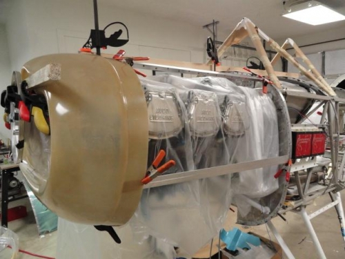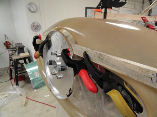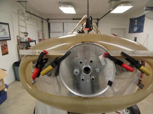 Built up a new jig using the prop bulkhead reversed on the flange. Using a 3/4 piece of wood and some clamps,affixed the cowl to the bulkhead as a starting point. Using spring clamps I installed the stiffeners and squared up the cowling relation to fuse. This takes a lot of time measuring for alignment, etc. Leveled and aligned the stiffeners with the longerons and the screw lines from behind the firewall. Ready to drill once I do another once over check.