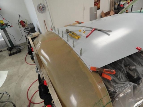 Drilled the balance of the attachment holes for top cowling panel. Stacked a 1.5 x .040 aluminum strip over the top two stiffeners, over which the hinge and top panel is placed. Then clamped in place and drilled. Started the task of fabricating the lower cowling panel. The firewal circumfrence was 62 inches and the nose bowl was 43 inches, nominal. Using some fibreglass sheeting as pattern material I made the first attempt at a layout. Long way to go.