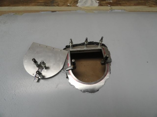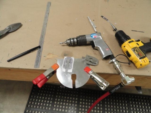 Started install of spring latch on Oil filler door. I scanned the latch into the computer and printed out 1:1. I then cut out and glued to the oil filler door. I then cut along the line and roto-filed to fit. Drilled and readied to rivet to door. I then laid out the oil filler door jam with .032 to match radius of door opening.