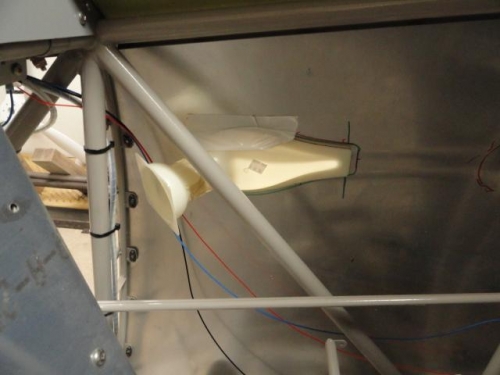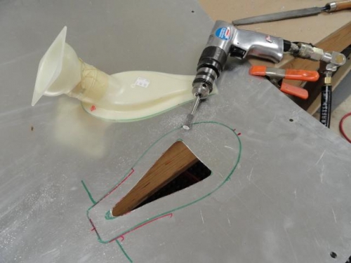Set up second NACA inlet. This one is for the left side. Used the same pattern to layout. Cut and filed opening. Adhered with 3M epoxy and flush rivets.