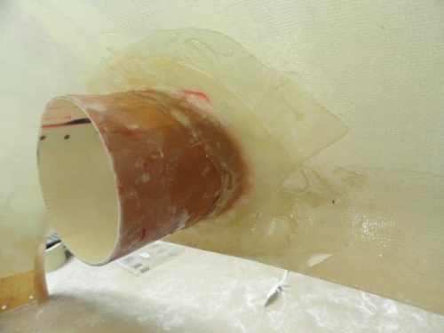 Spent some time positioning the inlet tube at such an angle to be only a slight off from the injector body, Taped in place and checked alignment in place. Began laying up fibreglass with 2 heavy weight 2 x 6 inch approx pieces layed over one another. Then reinforced with two more layers of lighter weight blending between the tube and the back of the bowl.