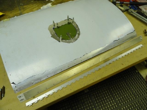 Decided to use AD protruding 1/8 rivets to attach top center cowling panel to the stiffeners. So, re-drilled to 1/8 all of the holes on the left side of panel and began bucking rivets. Match drilled holes through Nose bowl and firewall to accept stiffener and screws. Re-installed nut plates.